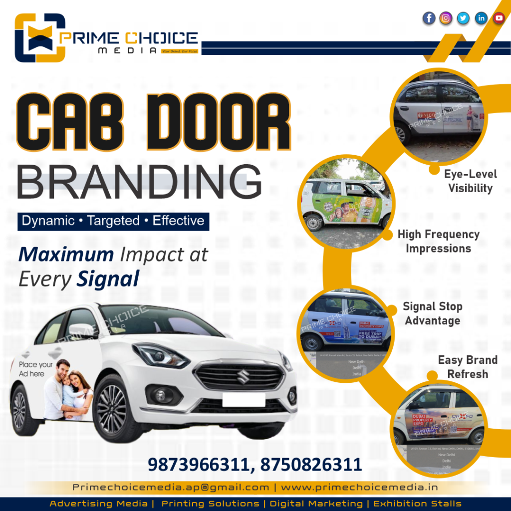Prime Choice Media offers complete cab door branding services, including creative design, high-quality vinyl printing, and professional installation. Available in single or both-side options, cab door branding is ideal for app promotions, retail offers, real estate projects, events, and city-wide awareness campaigns.