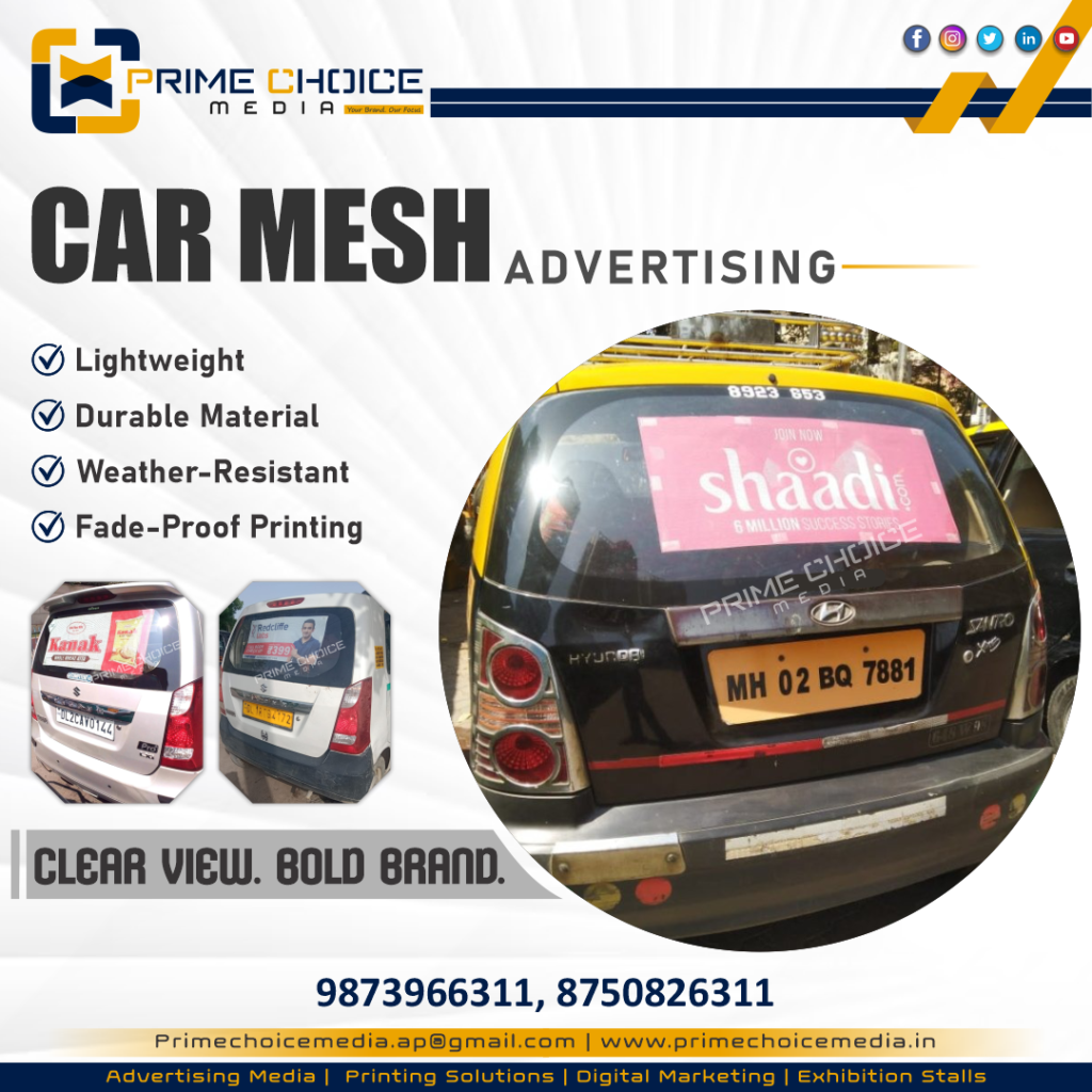 Car Mesh Advertising β Key Features -One-Way Vision Mesh Vinyl for safe inside visibility -High Outdoor Visibility on moving vehicles -Does Not Block Driver View -Lightweight & Durable Material -Weather-Resistant & Fade-Proof Printing -Cost-Effective Mobile Advertising -Wide City Coverage through daily movement -Easy Installation & Removal