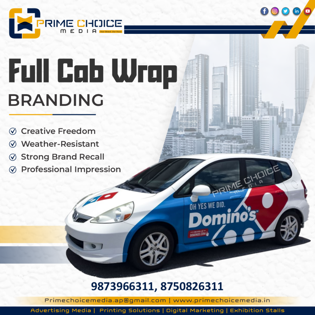 Full Cab Wrap Branding is a premium outdoor advertising solution that turns an entire cab into a powerful moving billboard. The complete exterior of the vehicle is wrapped with high-quality vinyl graphics, ensuring bold visuals and maximum brand exposure. As the cab travels across busy city roads, marketplaces, residential areas, and commercial hubs, your brand message reaches thousands of people daily. This format delivers strong visibility, repeated exposure, and excellent brand recall. Prime Choice Media provides end-to-end full cab wrap branding services, including creative design, high-resolution printing, and professional installation, making it ideal for product launches, app promotions, retail campaigns, real estate projects, and long-term brand awareness.
