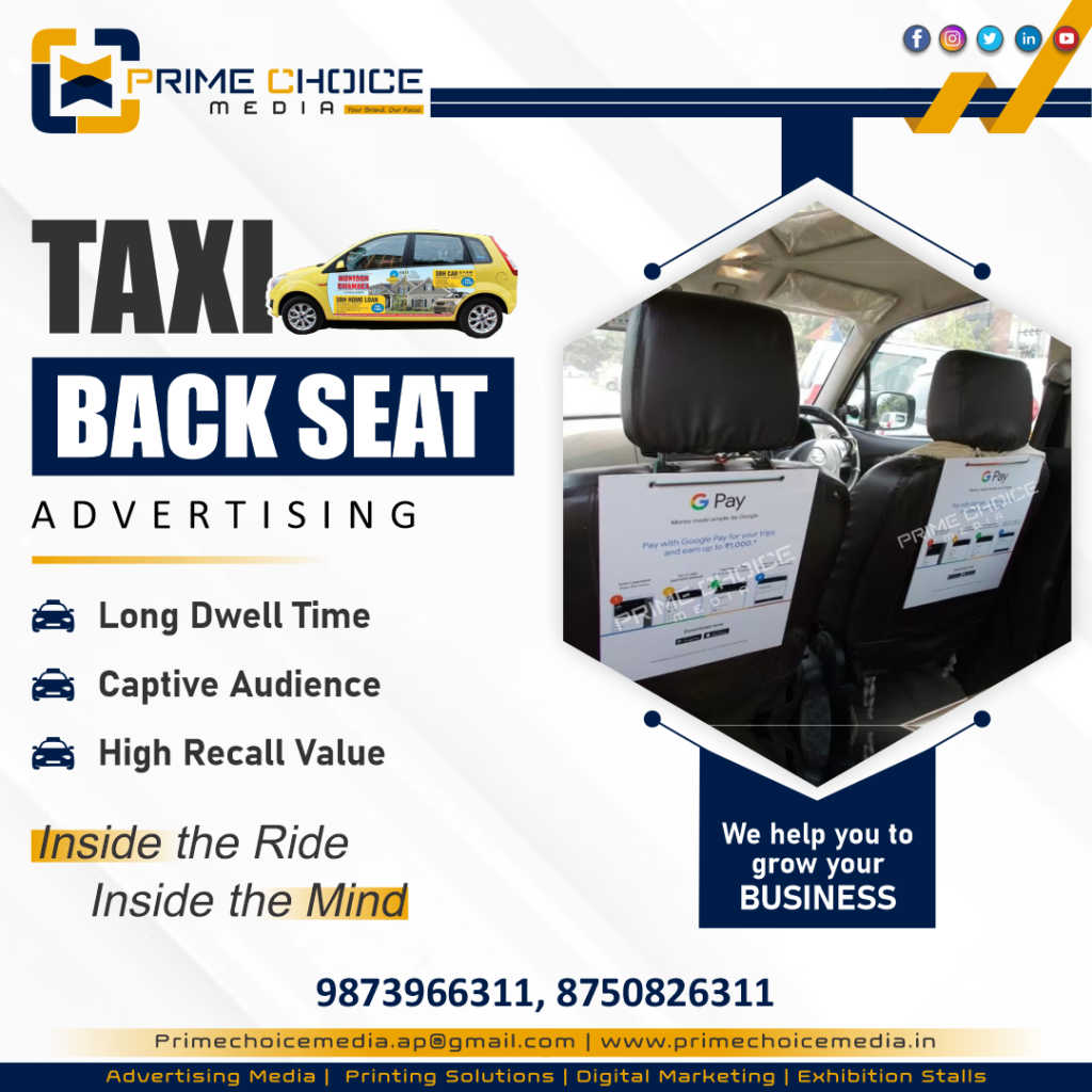 Prime Choice Media offers professionally managed taxi back seat advertising using high-quality posters, panels, or digital displays, depending on campaign requirements. This medium is ideal for app promotions, OTT platforms, education, real estate, retail offers, and local services. With targeted city coverage, flexible campaign durations, and cost-effective pricing, taxi back seat advertising helps brands connect with a captive audience and create meaningful engagement during every ride.