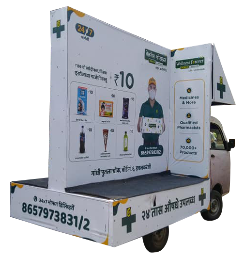 –Average Operational Hours/Day: 8 Hours –Average Distance/Day: 40 kms –The rates provided are exclusive of the printing and mounting charges. –The rates provided are inclusive of the permission charges. –The artwork will have 30-50% of regional language. –There are mainly 2 Type of Vans; TATA ACE & EICHER –This van is available in Four shapes; T-Shape , L-Shape , Cabin & LED Video.
